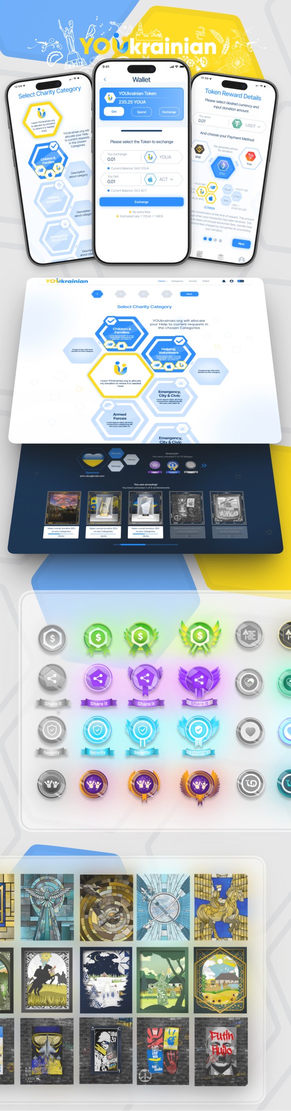 A charitable platform where users could donate and receive unique NFT badges as proof of support. Initially created to help streamline donations during the early stage of the war in Ukraine.